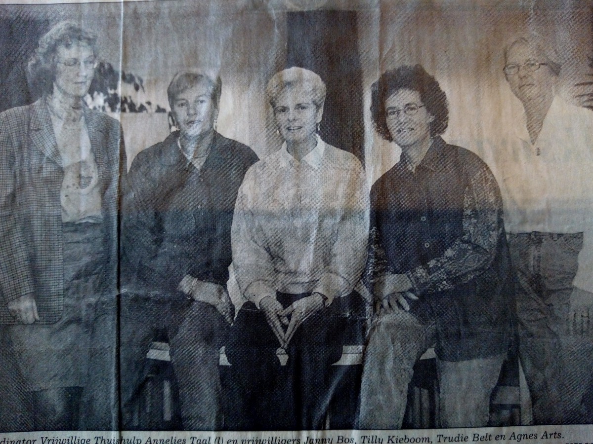 Toen de ergste rommel van de verhuizing was weggewerkt, wilde ik iets gaan doen ook omdat ik hier niemand kende. Het eerste contact met Manteling had ik met de coördinator Annelies Taal, op de zolder van Zorgstroom in de Brouwenaarstraat. Al snel had ik mijn eerste bezoekadresje. Ik werd ingezet bij een mevrouw met dementie en we gingen elke woensdagmiddag op pad. In mijn beleving was het toen altijd mooi weer! Het lopen voor haar werd wel steeds lastiger. Maar ze wilde beslist niet in een rolstoel! Ze dacht er niet aan! Op een dag gingen we samen lopend naar de rolstoelwinkel om er een te lenen. ‘Wil je er toch niet even in gaan zitten?’ zei ik. ‘Op voorwaarde dat we er om en om in gaan zitten en duwen’ was haar antwoord. Het eerste stuk, toen ik haar duwde ging prima. Maar toen we wisselden hebben we zo gelachen! Ze kon niet duwen en sturen, laat staan de stoep op of af. Toen was de drempel geslecht. Vanaf die dag gingen we samen mét de rolstoel naar de Boulevard, waar we lekker op een bankje bij konden kletsen.” Agnes staat rechts op de foto.