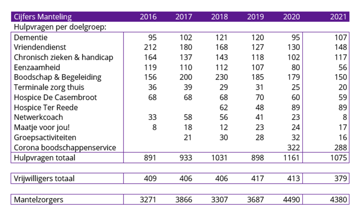 In onderstaand overzicht staan de aantallen hulpvragers, vrijwilligers en mantelzorgers van Manteling van 2021 afgezet tegen de aantallen van de voorgaande jaren.