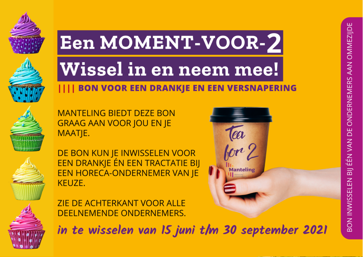 Zeven enthousiaste horecaondernemers op Walcheren werden bereid gevonden om hieraan mee te werken: het Koffiepand, de Juf, het Polderhuis, Jells, Expresso, Brasserie Bonnes en de Babbelaar. Dankzij hen konden we onze plannen voor een MOMENT-VOOR-2 realiseren. Er werden MOMENT-VOOR-2 bonnen ontworpen, gedrukt en verspreid onder onze hulpvragers en vrijwilligers.  Deze bon konden de maatjeskoppels in de zomer en nazomer van 2021 bij één van de samenwerkende horecaondernemers inwisselen voor een drankje met iets lekkers erbij. Een mooi moment samen.